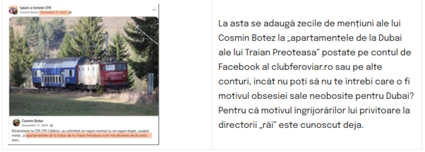 dovezi că platforma este un mijloc profitabil de șantaj și scena unui cabotinism dezgustător. De pildă, de pe „ilustra” platformă cititorul avizat nu prea află informații despre situația deplorabilă a căilor ferate, însă descoperă aversiunea lui Cosmin Botez față de directorii „răi” ai CFR, care conduc regionale ce nu sunt „darnice” cu acesta și companiile sale, dar și obsesia sa pentru… Dubai. Doar astfel se explică multele articole publicate pe clubferoviar.ro despre directorul CFR Călători SA Traian Preoteasa, directorul CFR SA Ion Simu Alexandru sau ministrul Transporturilor Sorin Grindeanu și legăturile acestora cu cosmopolitul oraș din Emiratele Arabe Unite. În nu mai puțin de nouă articole scrise în ultimii ani, cititorul este informat că Traian Preoteasa are nu unul, ci două apartamente „de lux” în Dubai, achiziționate în timp ce CFR Călători SA suferea „pierderi” de jumătate de miliard de lei, iar mecanicii primeau „căldură cu program” în dormitoare, că Ion Simu Alexandru și-a petrecut vacanțele în locuri „exotice” din Dubai și că și-a amenajat biroul astfel încât să reproducă „opulența” cu care este obișnuit în Dubai, ori că Sorin Grindeanu a făcut o vizită „surprinzătoare” în Dubai, în 2022, tocmai de Ziua Națională.