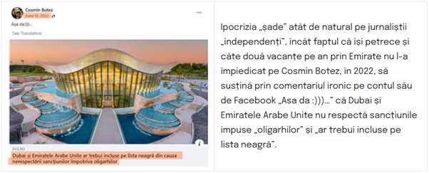 Ipocrizia „șade” atât de natural pe jurnaliștii „independenți”, încât faptul că își petrece și câte două vacanțe pe an prin Emirate nu l-a împiedicat pe Cosmin Botez, în 2022, să susțină prin comentariul ironic pe contul său de Facebook „Asa da :)))…” că Dubai și Emiratele Arabe Unite nu respectă sancțiunile impuse „oligarhilor” și „ar trebui incluse pe lista neagră”.